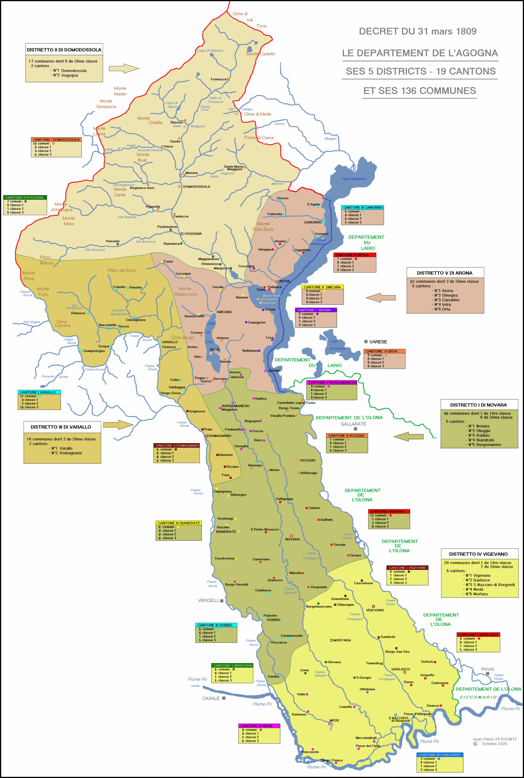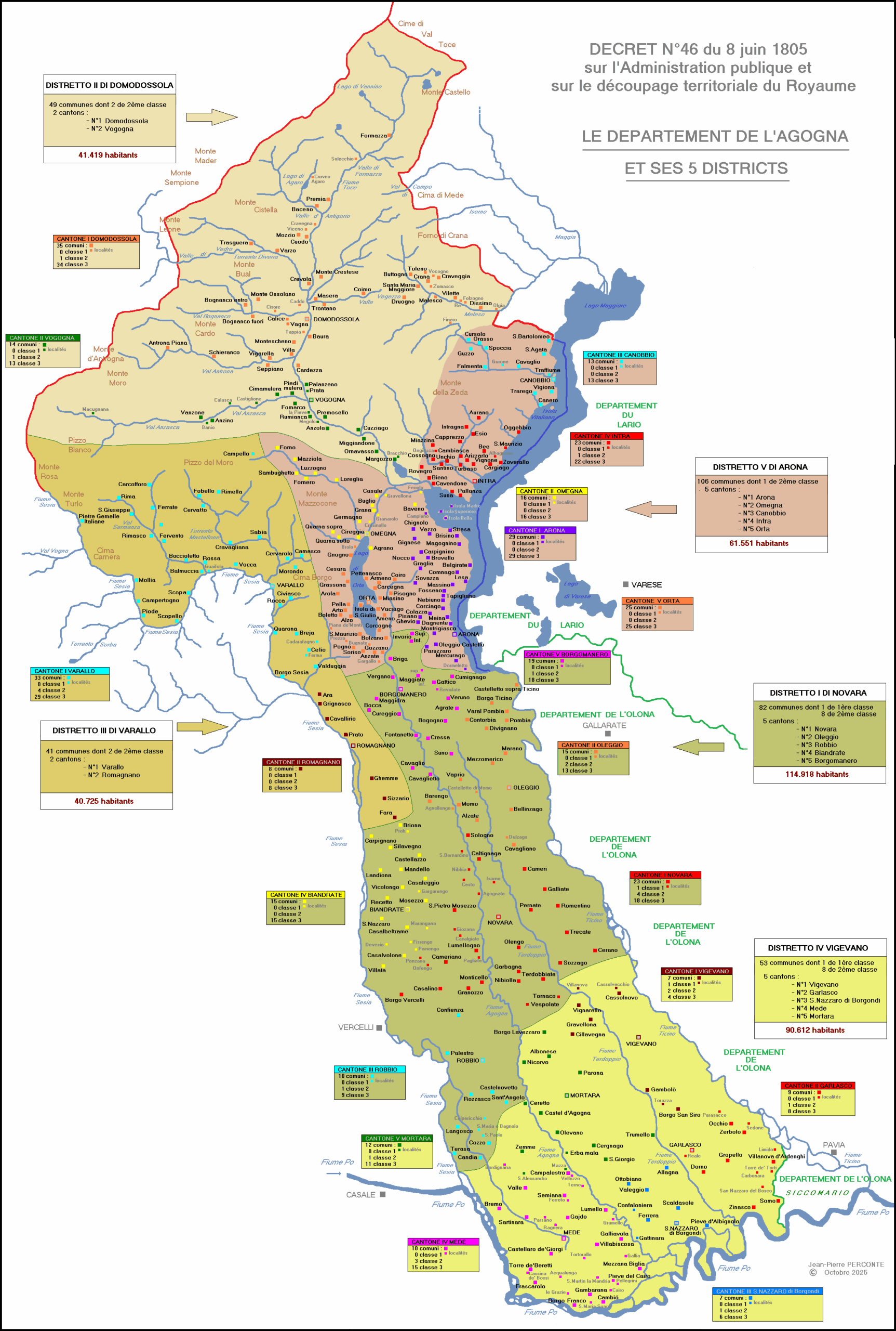Ainsi suite au décret du 8 juin 1805, le département de l’Agogna est divisé en 5 districts, 19 cantons et 331 communes dont 2 de 1ère classe (Novara et Vigevano) et 23 de 2ème classe (voir ci-après carte reconstitué pour ce décret du 8 juin 1805).
