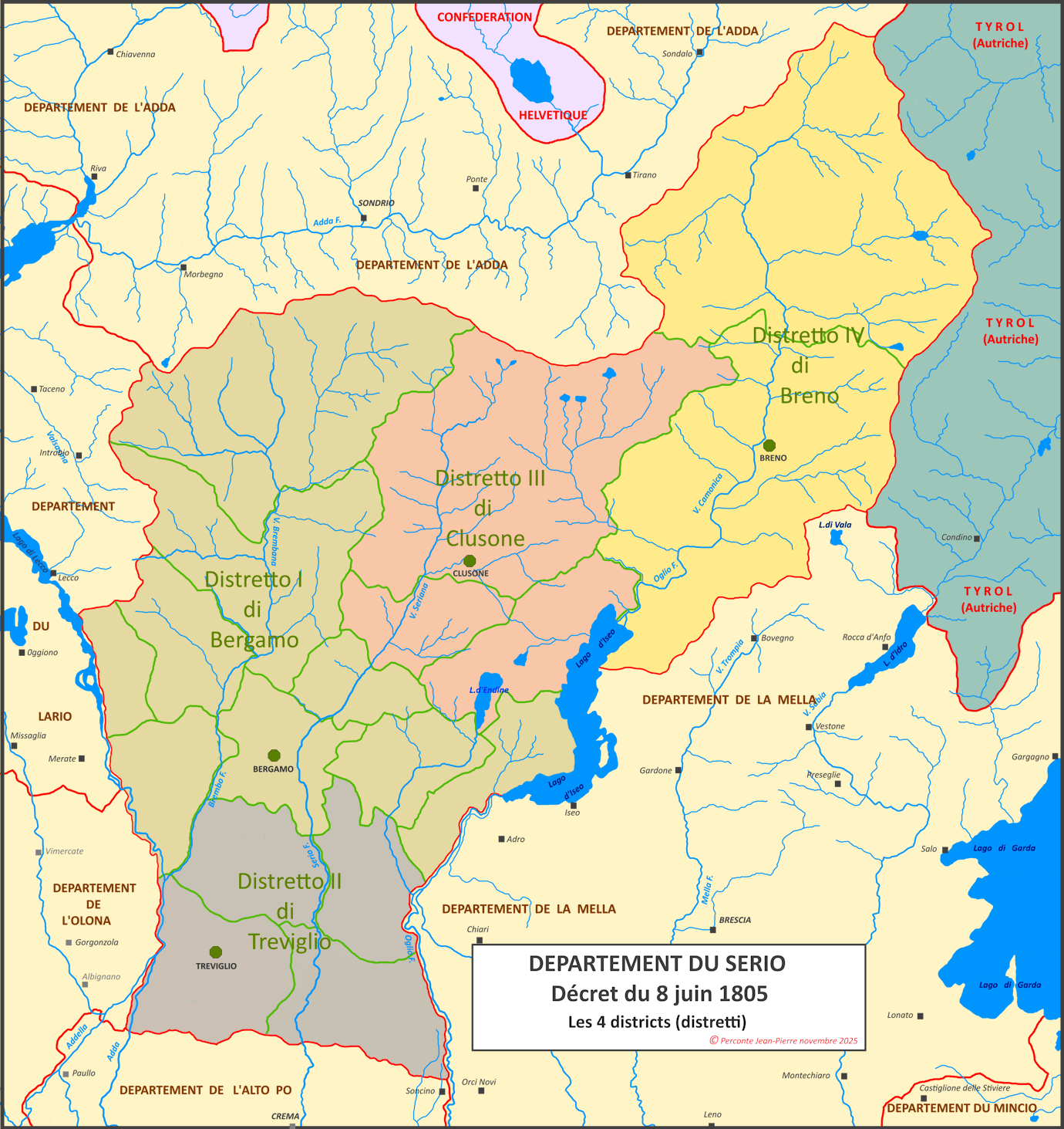 Le décret du 8 juin 1805 (01) qui précise la nouvelle répartition du Royaume d’Italie en Départements, districts, cantons et communes (02), organise le département du Serio (Dipartimento del Serio) en 4 districts (distretti).